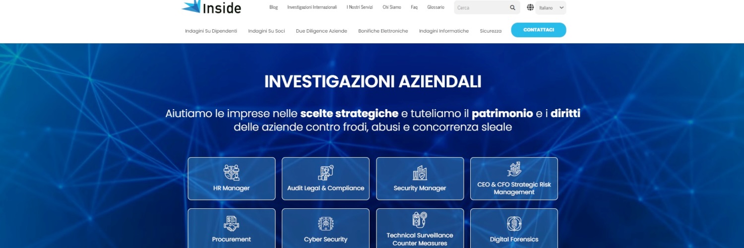 Inside è un’agenzia investigativa internazionale specializzata in investigazioni aziendali, che assiste imprese ed organizzazioni nella verifica dei rapporti con i propri partner commerciali ed impiegati attraverso indagini sui dipendenti, indagini